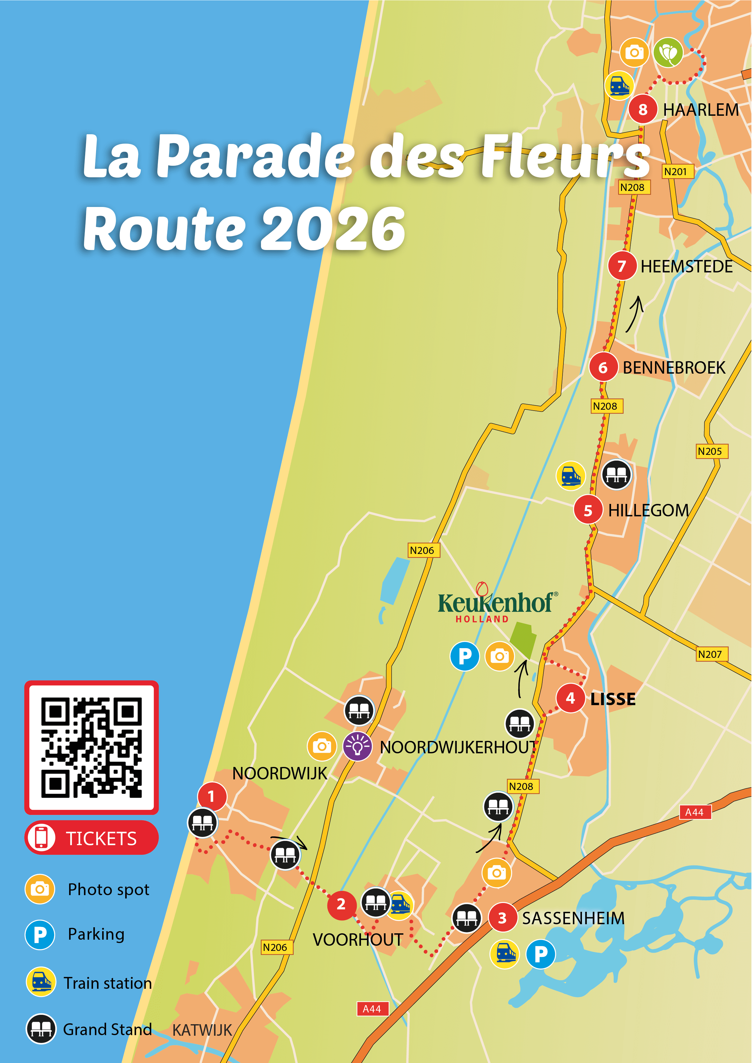 Vous trouverez ci-dessous l’itinéraire avec plus de détails. Il est conseillé de se rendre à la Flower Parade bien à l’avance, car des foules sont attendues et de nombreuses routes seront fermées à l’occasion de la Flower Parade.